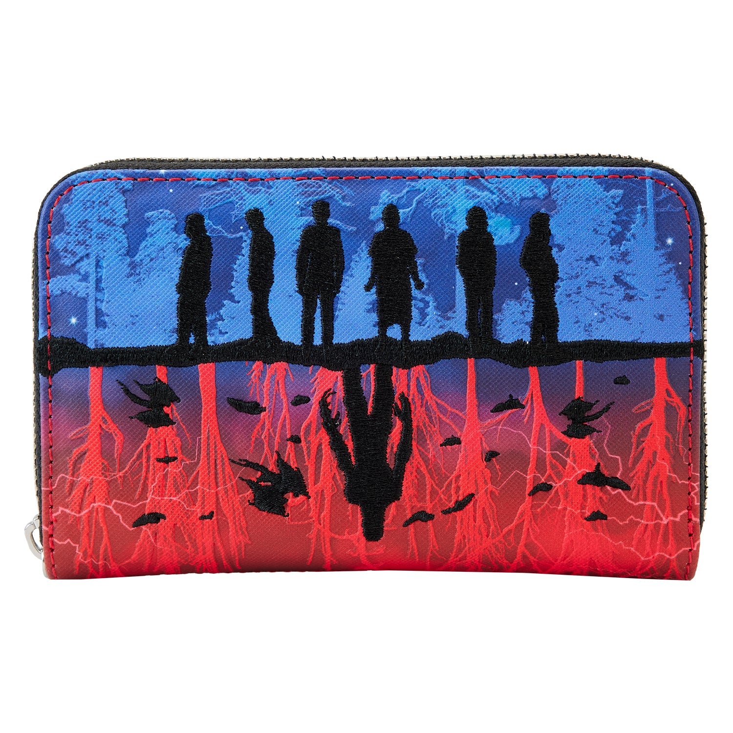The Loungefly Netflix Stranger Things Upside Down Shadows Zip-Around Wallet is made of vegan leather (polyurethane). Wallet zips closed with shiny silver-colored metal hardware. Additional features include applique, embroidered, debossed, and printed details. Take note of the coordinating inside lining.