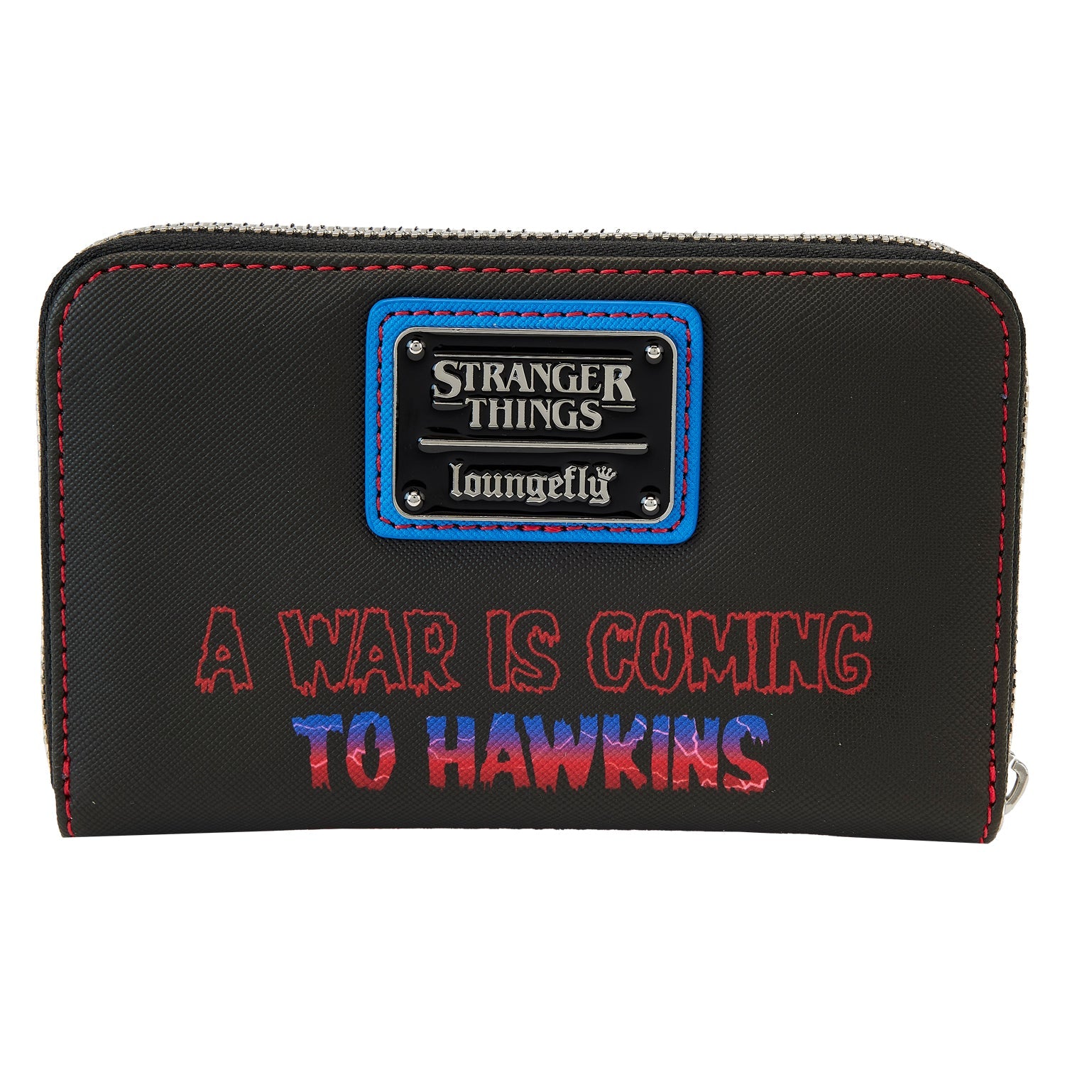 Take on the creatures of The Upside Down in style! Our Loungefly Netflix Stranger Things Upside Down Shadows Zip-Around Wallet is ready for your adventures. This mesmerizing accessory features the shadows of Eleven, Dustin, Lucas, Max, Will, and Mike, as they stand over the edge of The Upside Down. A midnight blue background, with etchings of tree limbs and stars, creates a mysterious and dramatic contrast. Below them, The Upside Down appears in red, with lightning flashes. The shadow of Vecna looms, upside down, along with Demobats, flying through trees. On the back, the following words appear in red and blue: “A War is Coming to Hawkins.” Inside, there are 5 slots for holding cards and 1 clear slot for displaying your ID. A die-cut shape of a Demogorgon adds a unique touch. Gear up for fun adventures and show off your favorite fandom fashion.