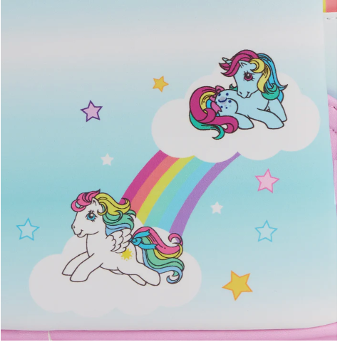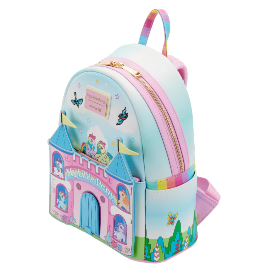 Make each day shine a bit brighter with the magic of a beloved childhood classic. The Loungefly My Little Pony® Castle Mini Backpack is ready to dazzle your collection. This whimsical accessory portrays the Dream Castle where Glory, Windy, Skydancer, Butterscotch, Sunlight, and Blossom have gathered to play. Open the functional drawbridge flap to reveal Parasol and Medley, who are eager to greet you! Two bluebirds fly high in the sky above the castle towers, which include 3D flags. On the back, Starshine and Moonstone appear on clouds surrounded by stars and rainbows. This mini backpack adds a dash of flair to any outfit and is the perfect addition to your My Little Pony collection.