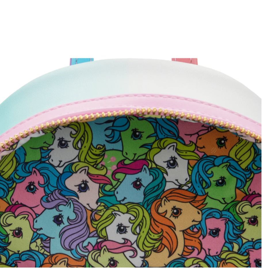 The Loungefly My Little Pony Castle Mini Backpack is made of vegan leather (polyurethane). Bag has adjustable shoulder straps and sturdy gold hardware. Additional features include applique, embroidered, embossed, and printed details. Take note of the coordinating inside lining.